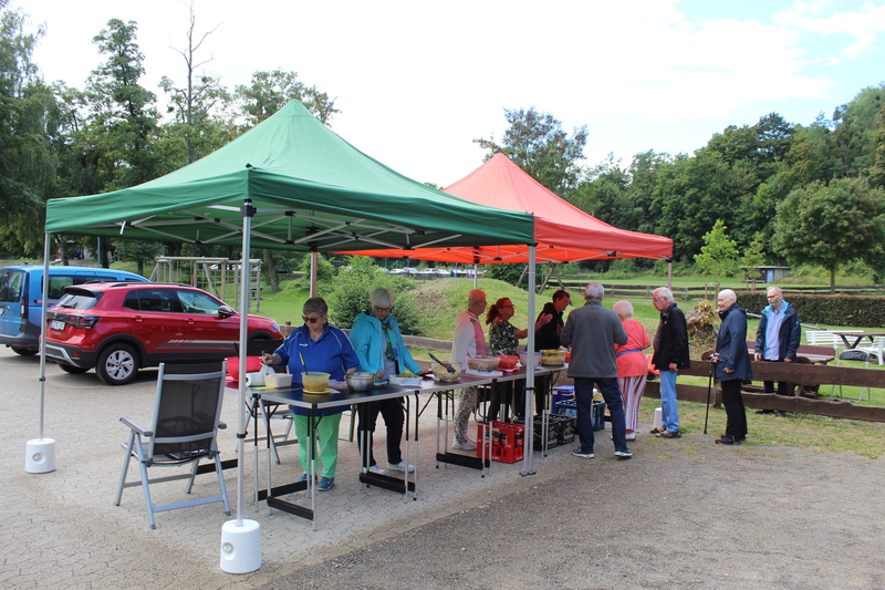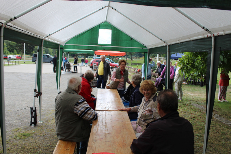 Für das Orgateam und den Helfern ging es schon früh um 9.00 Uhr los, Zelte wurden aufgebaut, Tische und Bänke zusätzlich aufgestellt und alle vorhandenen „Möbel“ abgewaschen. Die „Griller“ glühten schon einmal die Holzkohle vor. Die Küche füllte sich schnell mit leckeren Salaten und Kuchen.